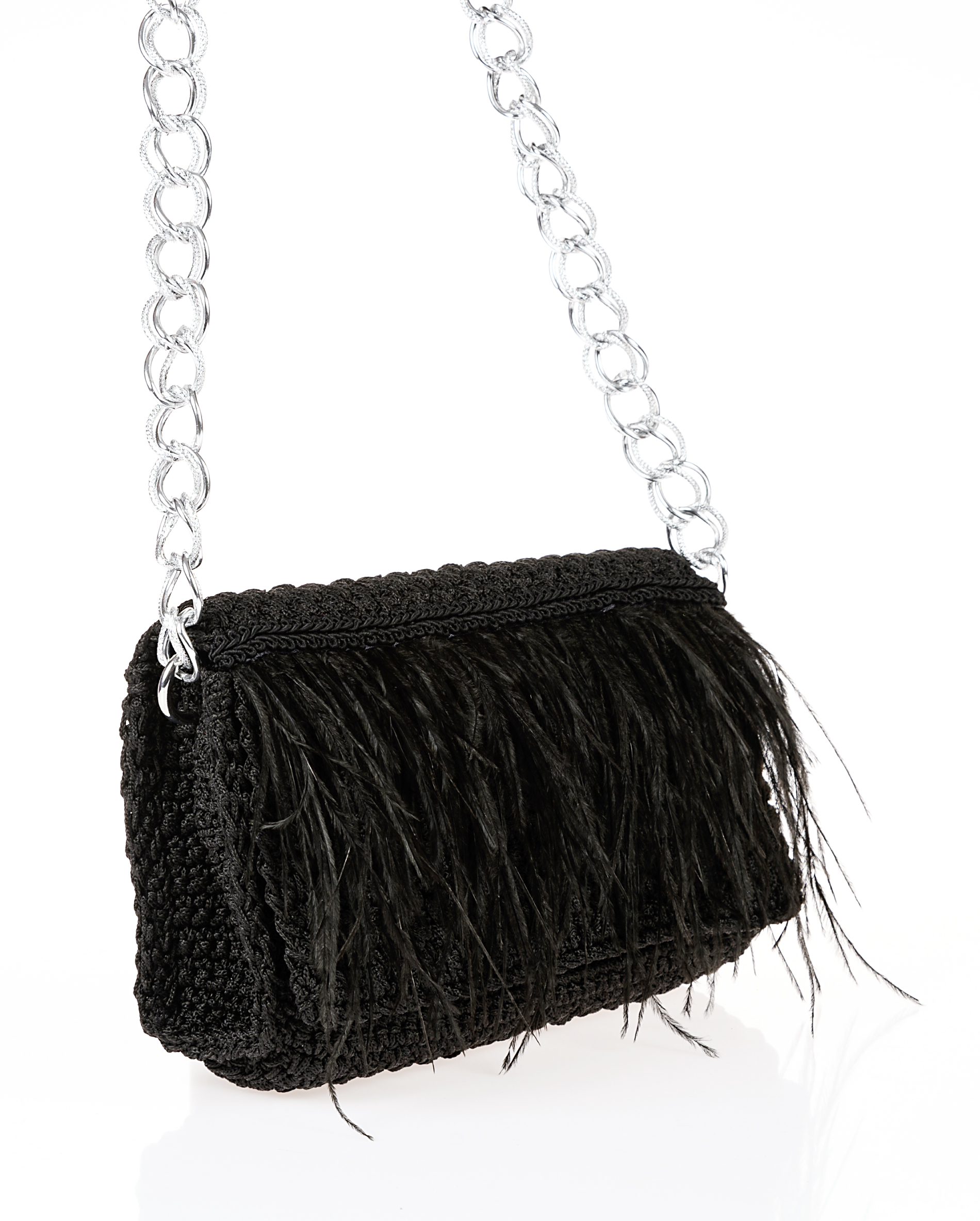 Perfect for a night out at a club or a formal event. Knitted shoulder bag with knitted bubbles on the lid. Long aluminum shoulder chain in gun metal color. The inner lining is unique to each bag using recycled clothing materials. It has two sturdy magnetic buttons. It will not stretch as it has internal support. It can be easily cleaned with a damp cloth. 13(h)x25(l)x8(w)