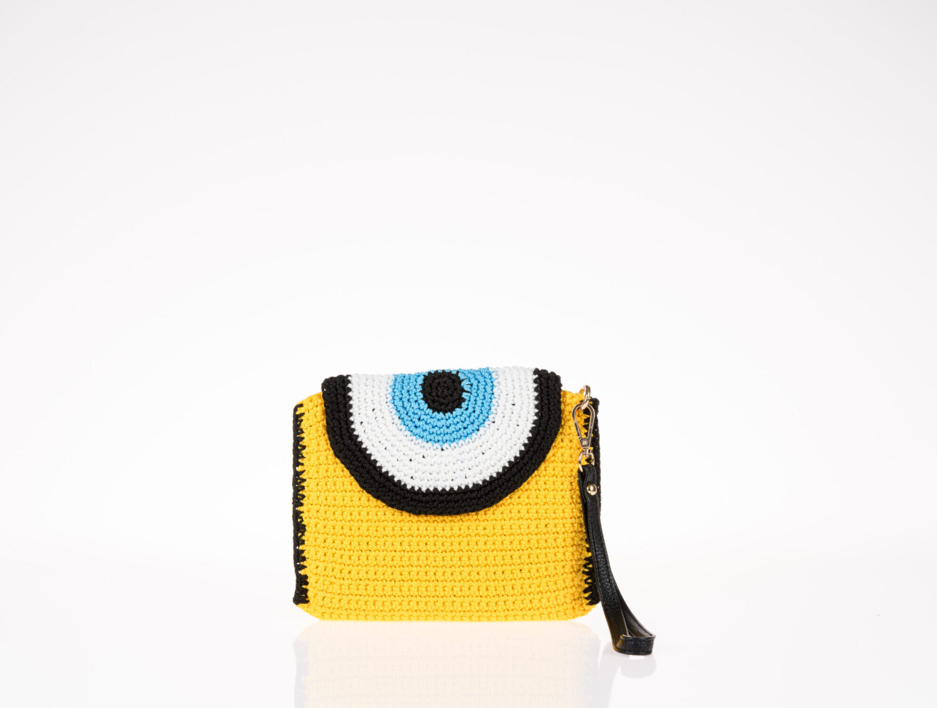 Crochet mini handbag with the evil eye on the lid. Short vegan leather handstrap in black color. The inner lining is unique to each bag using upcycled clothing materials. It has one sturdy magnetic buttons. It will not stretch as it has internal support. It can be easily cleaned with a damp cloth. 18(h)x21(l)