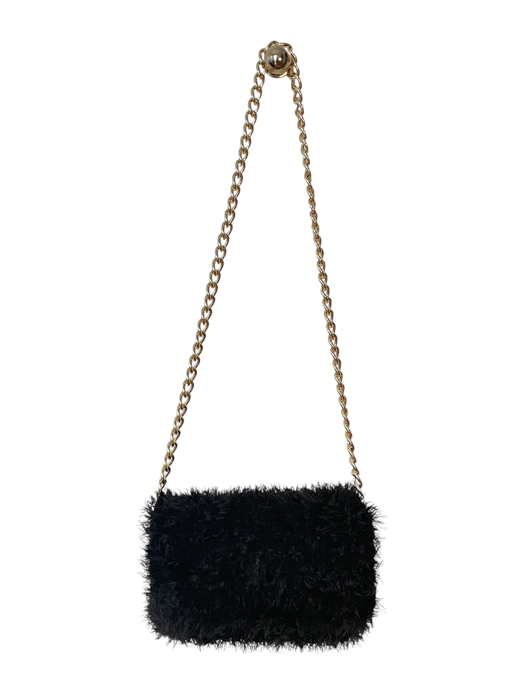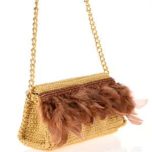 Πλεκτή τσάντα ώμου με χνουδωτή υφή. Μακριά αλυσίδα ώμου σε χρυσό χρώμα αλουμινίου. Η εσωτερική επένδυση είναι μοναδική για κάθε τσάντα τύπου μπροκάρ με χρυσά μοτίβα.